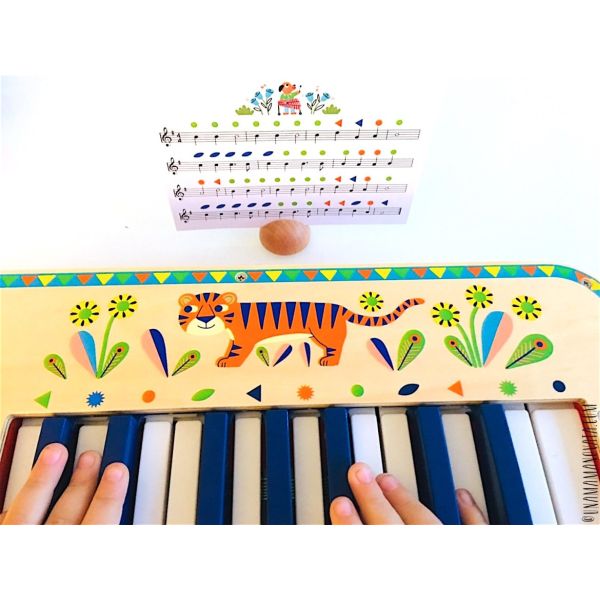 Amb les partitures que inclou es poden tocar 4 cançons populars o compondre altres peces, segons es desitgi. Cada nota es reemplaça amb un signe de color imprès davant de les tecles del piano: n’hi ha prou amb seguir els mateixos signes de color en la partitura per a tocar i descobrir la música. Funciona amb 4 piles AA (no incloses).