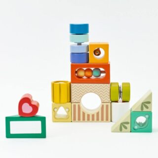 Els blocs són de diferents formes i cadascun d’ells amaga un fascinant efecte acústic, visual… Hi ha moltes maneres de jugar amb ells; sacsejant-los, empenyent-los, apilant-los, fent-los rodar…