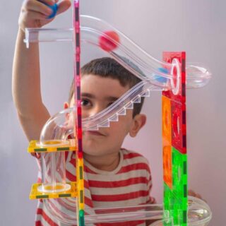 Joc de construcció de tobogans magnètics Imanix amb 70 peces geomètriques translúcides de colors.