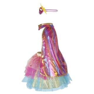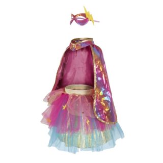 La capa de color rosa està folrada per a un acabat elegant. Hi ha detalls d’estrelles i llampecs a les faldilles i les màscares són de doble cara.