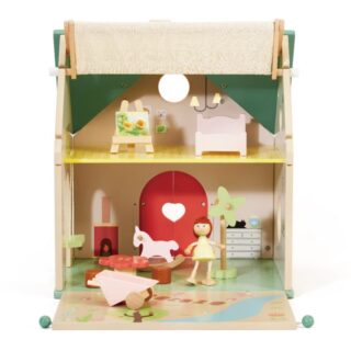 Aquesta caseta de fusta inclou diversos accessoris per a desenvolupar el joc creatiu, com a gronxador, cavall balancí, carro de jardí, cavallet d’art i mobles.
