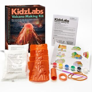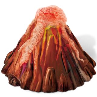 Conté: un motlle de volcà, dues bosses d’escaiola de bona qualitat, una paleta de sis colors, un pinzell, un utensili per barrejar, un full amb imatges divertides per decorar i un llibre d’instruccions que inclou fets científics sobre els volcans i com fer que el teu volcà entri en erupció.