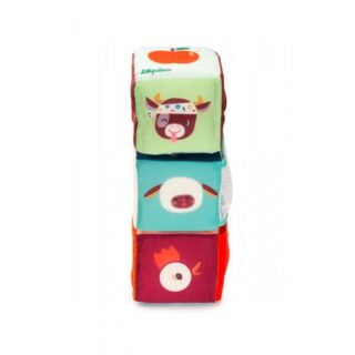Aquest joc de la granja evolutiu consta de 3 cubs de roba i 3 personatges de fusta. Cada costat ofereix un nou desafiament: muntar el burro, aprendre a comptar o reconèixer els números de l’1 al 3.