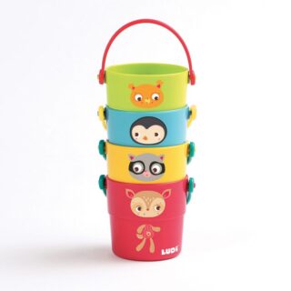 4 galledes de colors amb animalons petits per a abocar aigua i apilar. El seu fons perforat deixa caure l’aigua en forma de pluja.
