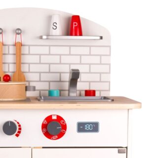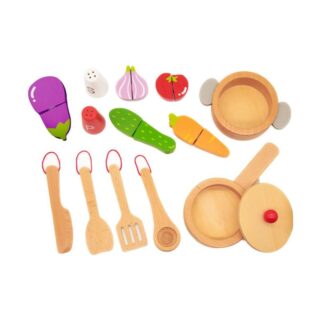 Inclouen diferents accessoris de fusta per a fomentar un joc de rols fàcil i divertit com són: aliments per a rentar, tallar i cuinar, utensilis de cuina, sal per a potenciar el sabor…
