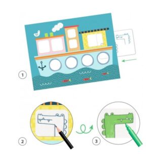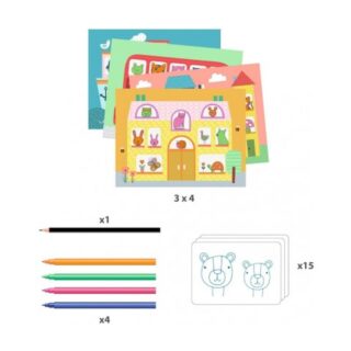 Contingut: 12 làmines il·lustrades amb calcs (28 x 21 cm), 15 targetes de calc (10 x 7 cm), 1 llapis amb goma d’esborrar, 4 retoladors (groc, rosa, verd i blau) i 1 quadernet d’explicacions pas a pas.