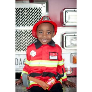 El conjunt inclou una bata vermella amb detalls de cinta reflectant, una gorra de bomber de plàstic amb emblema, una placa d’identificació personalitzada extraïble, una destral de joguina i un extintor d’incendis de joguina (que en realitat és com una pistola d’aigua!).