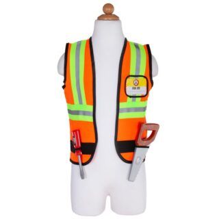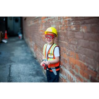 Aquest joc inclou una armilla taronja amb línies reflectants, un casc de seguretat amb calcomania, un martell de plàstic per jugar, una miniserra de plàstic per jugar, un tornavís de plàstic per jugar, ulleres de seguretat i una etiqueta amb el teu nom perquè tots els teus companys de feina sàpiguen el teu nom.