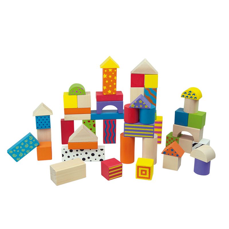 Conjunto de 50 bloques de madera maciza de colores para que tus niños o niñas se diviertan mientras aprender a combinar figuras y diferentes piezas de construcción.
