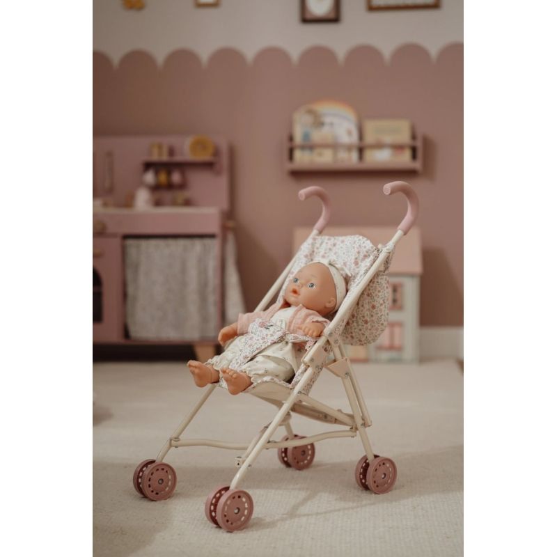 Este cochecito de metal para muñecas es perfecto para acompañar las aventuras de tu bebé. Con una robusta estructura en blanco roto, delicados detalles en rosa y un asiento con el alegre diseño Soft Flowers, este cochecito no solo es práctico, sino también muy bonito.