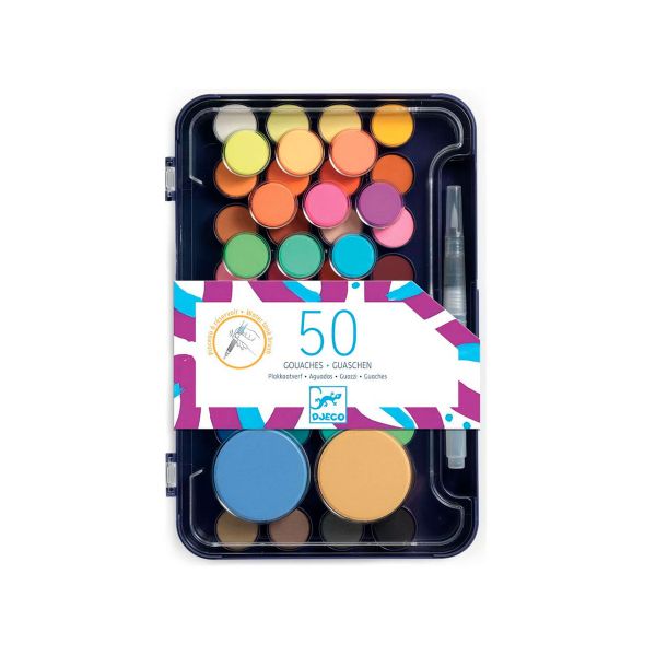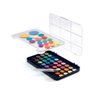 Contenido: doble paleta con bandeja desmontable con 53 tonos de témpera: 36 colores clásicos, 9 colores fluorescentes, 8 colores nacarados + 1 pincel con tanque de agua.