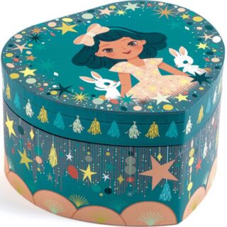 -Happy party es una caja de música en forma de corazón fantásticamente ilustrada para guardar joyas y secretos. Gira la manivela, abre la caja y ¡sorpresa! Una bailarina perfectamente esculpida gira y se refleja en un espejo con forma al compás de la melodía de «Cuentos de los bosques de Viena», de Johann Strauss.
