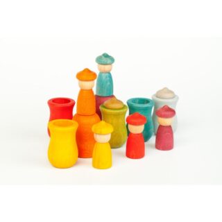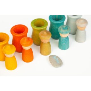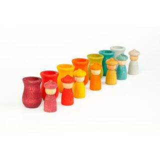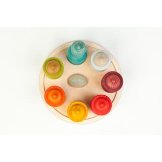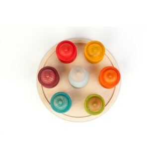 Contiene 7 Nins®-bellota en 7 colores que se asocian con cada día de la semana de acuerdo con la pedagogía Waldorf. 7 vasijas y 1 plato redondo (18cm de diámetro) donde están contenidos los elementos.