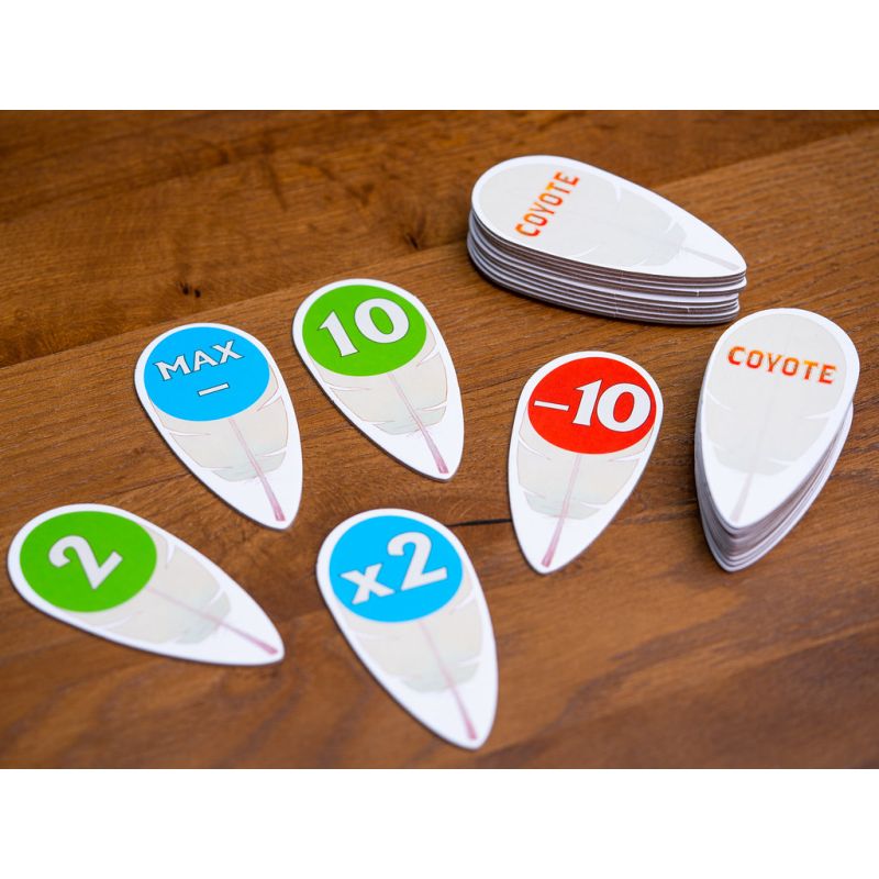 El funcionamiento de Coyote es un juego muy sencillo de cálculo numérico en el que los jugadores intentan adivinar una cifra intentado que no sea un valor mayor que el número de indios que hay en la mesa. Para ello debemos contar el número de plumas en las cartas de todos los rivales de la mesa. Pero como no conoces el valor de tus plumas, deberás intentar adivinarlo de tal forma que al decirlo parezca que es verdad.