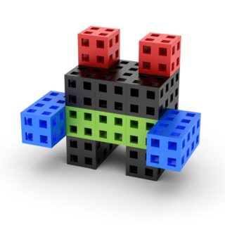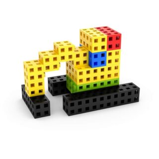 Los bloques Meli Cube tienen forma de pequeños cubos (2 x 2 x 2cm) hechos de un material suave y seguro para los niños. Cada pieza tiene cuatro clavijas en un lado y cuatro agujeros en los otros lados. Esto hace que los cubos sean fáciles de conectar y desmontar para crear diversos objetos en 3D.