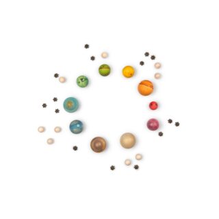 DEAR UNIVERSE contiene más de 40 piezas de madera con unas medidas desde 1,2cm hasta 4,5cm.