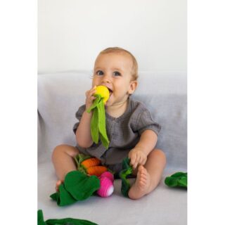 -Puede usarse como mini doudou-mordedor, juguete de baño y juguete sensorial.