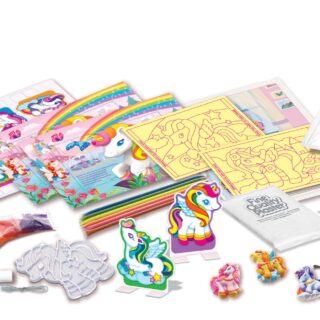 El unicornio es un animal fantástico, elegante y, además, es el animal de moda. A los peques les encanta, y es por eso que este kit les va a enamorar ya que podrán realizar diferentes actividades con figuritas de unicornios: crear imanes para la nevera, crear cartas de unicornio, confeccionar marcos con una ilustración fantasía o elaborar un cairel de unicornio cristalino. ¡este kit asegura horas de entretenimiento y diversión!