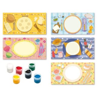El juego incluye: 12 grandes mantelitos ilustrados, un set de pintura de dedos de alta calidad y una completa guía llena de consejos.
