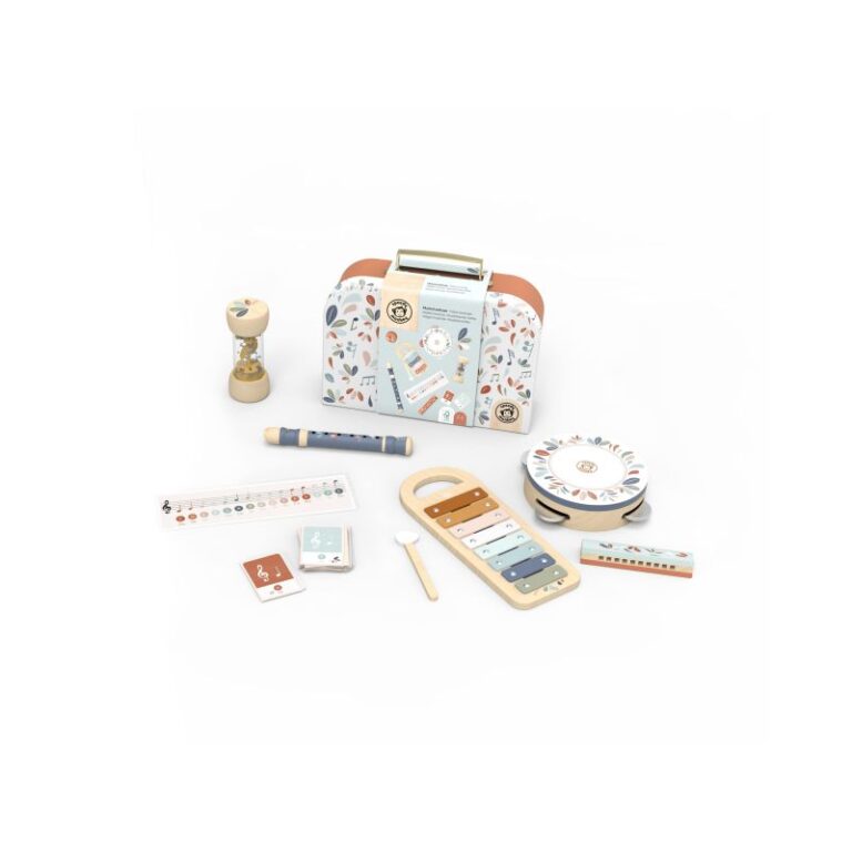 Esta maleta incluye 5 instrumentos musicales: El xilófono con ocho teclas metálicas de colores, la pandereta producirá un sonido suave y divertido, el palo de lluvia de madera que recrea el suave sonido de la lluvia cuando las cuentas caen en cascada al girar el instrumento, la flauta colorida con pintura no tóxica e insípida diseñada para principiantes y la armónica sin duda hará las delicias de los más jóvenes, ya que no se requiere experiencia.