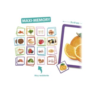 Juego de memoria con 17 parejas de fichas de gran tamaño con imágenes reales de alimentos sanos.