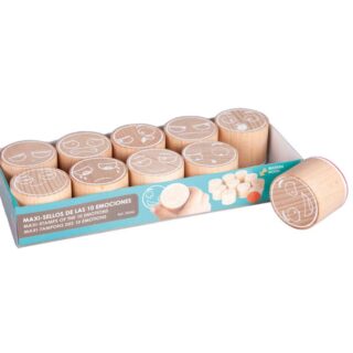 Set con 10 maxi-sellos para jugar y representar las 10 emociones básicas que guían nuestro comportamiento: alegría, seguridad, admiración, curiosidad, sorpresa, ira, asco, tristeza, miedo y culpa.