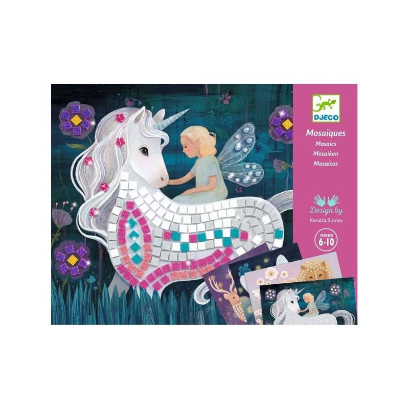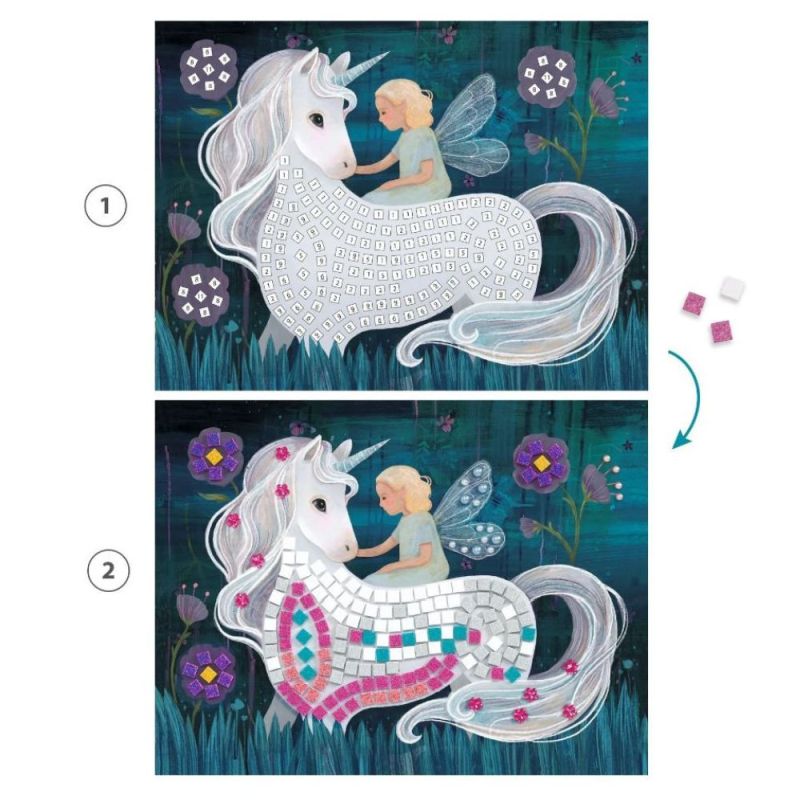 Contenido: 4 tarjetas ilustradas, 16 hojas de cuadrados de espuma autoadhesiva con purpurina, 4 hojas de strass autoadhesivas, 1 folleto explicativo paso a paso a color.