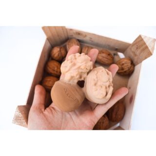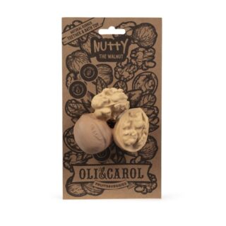 Nutty the Walnut es un mordedor, juguete de baño y juguete de juego sensorial para bebés con forma de nueces. Sus texturas estimulan sus sentidos y alivian las molestias durante la dentición.