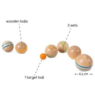 Incluye: 3 juegos de bolas de madera (6 en total), 1 bola pequeña de 6,5 cm. de diámetro y 1 bolsa de almacenamiento.