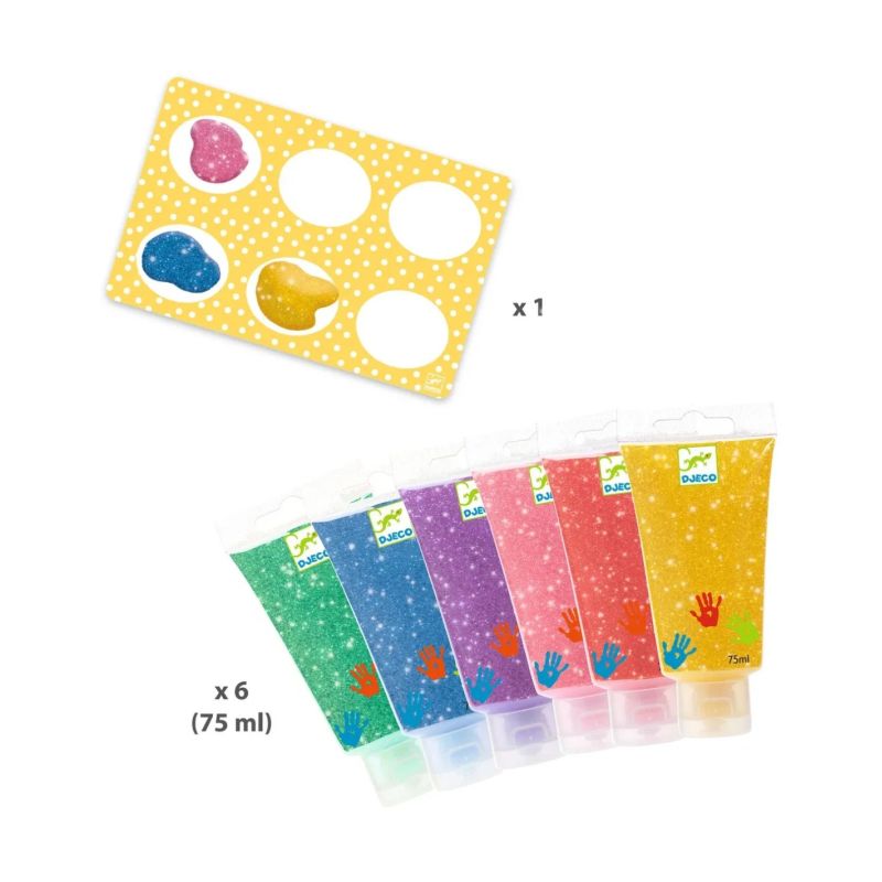 Contenido: 6 tubos grandes de pintura (6 x 75 ml) para dedos con purpurina (rosa, dorado, azul, verde, morado, rojo) y 1 paleta.