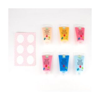 Contenido: 6 tubos grandes de pinturas de dedos (6 x 75 ml): azul, azul claro, morado, rosa, beige, amarillo y 1 paleta.