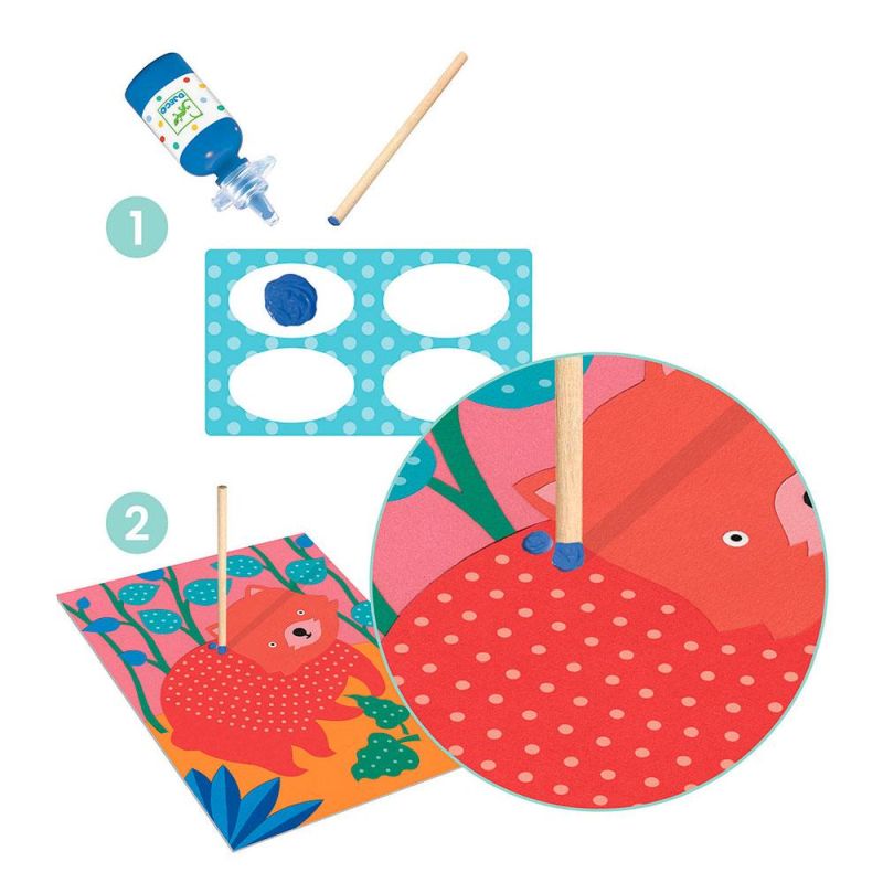 El niño dispone de 4 palillos que sumerge en la pintura. Luego, aplica los colores a las ilustraciones.