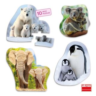 Set de 10 puzles (de 4 a 8 piezas) de gran tamaño con fotografías de animales y sus crías.