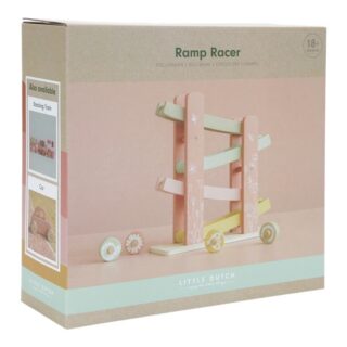 1, 2, 3 y ¡empieza! Con esta rampa de carreras de madera floral que incluye 4 ruedas decoradas, tu pequeño se lo pasará en grande.