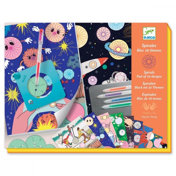 -Un cofre de dibujo para hacer bellas espirales de colores y completar así las láminas propuestas en este bloc de 30 páginas, cuyas ilustraciones abarcan 10 temas diferentes.