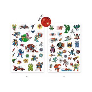 Dos láminas de tatuajes temporales con héroes con superpoderes y los villanos a los que se enfrentan. ¡Para el deleite de los niños, están cubiertos con detalles metalizados!