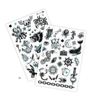 Dos hojas de calcomanías con una representación realista que presenta los temas de tatuaje habituales adaptados especialmente para niños.