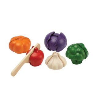 El set de vegetales de 5 colores viene con un cuchillo y 5 vegetales cortados.