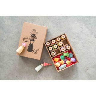 El set permet als nens explorar per si mateixos a través de totes les seves fases d’aprenentatge. És un gran complement per al joc simbòlic, la narració d’històries i els mini mons, també per apilar, encaixar, alinear, classificar. Les possibilitats són infinites!