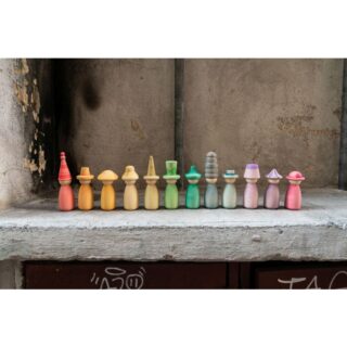 El set conté 12 Nins pintats a mà en els 12 colors de l’arc de Sant Martí amb barrets i cossos intercanviables per a oferir encara més combinacions d’acolorides possibilitats a cada activitat de joc obert.