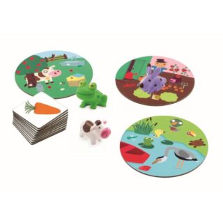 Les tres escenes del joc es posen al centre de la taula i cada animal al seu costat: el conill amb l’hort, la vaca amb la granja i la granota amb l’estanc.