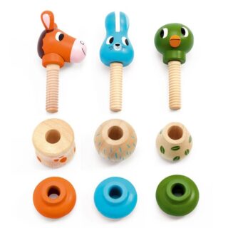 Un joc de muntatge per a formar 3 animals de fusta (un cavall, un conill i un ànec)! El nen tria un cargol amb la forma del cap d’un animal i busca el cos i la base del mateix color per a caragolar-lo. Uneix les peces caragolant-les i després juga amb els animals.