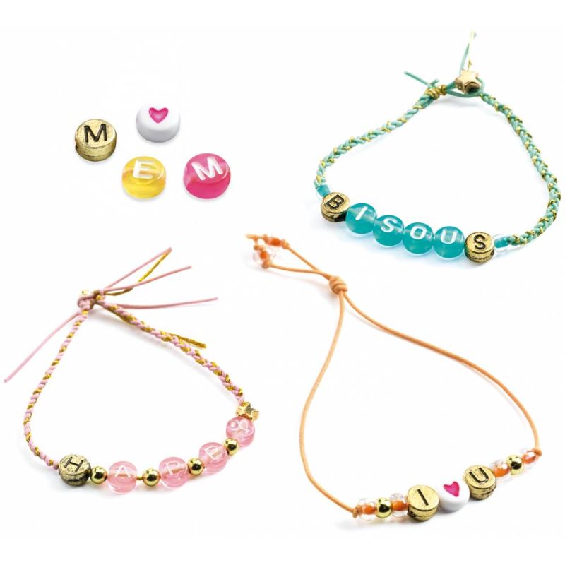 -Un cofre molt complet que conté una multitud de perles de l’alfabet de colors i daurades, així com diversos fils per a crear boniques peces de bijuteria amb noms o missatges.
