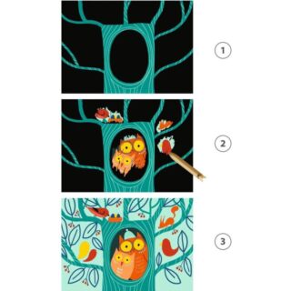 Contingut: 5 quadres per rascar (21 x 28cm), 1 punxó de fusta amb punta arrodonida i 1 fullet amb instruccions pas a pas.