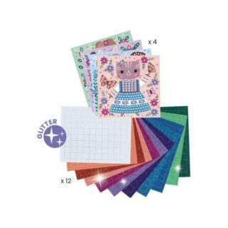 Contingut: 4 targetes il·lustrades, 12 lamines de quadrats d’escuma autoadhesiva amb purpurina, 1 fullet amb instruccions pas a pas a tot color.