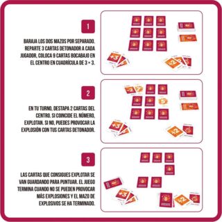 3-Les cartes que aconsegueixes explotar es van guardant per a puntuar. El joc acaba quan no es poden provocar més explosions i el piló de cartes d’explosius s’ha acabat.