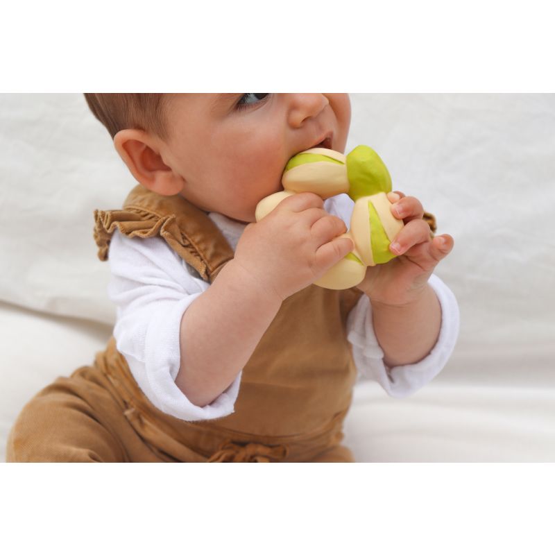 Totes les joguines de Oli and Carol estan fets seguint un procés artesanal amb cautxú 100% natural extret dels arbres Hevea. Estan fets d’una sola peça i no tenen forats, per la qual cosa s’evita la creació de bacteris en el seu interior. Estan pintats a mà amb pigments naturals un a un, cadascun és únic!