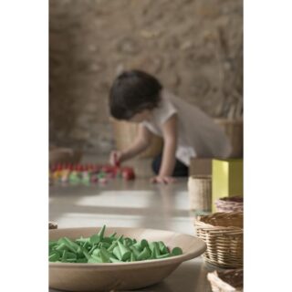 Les peces soltes són un material no estructurat amb moltes propostes de joc. Inclou 36 peces de fusta en forma de con en 3 colors verds diferents (12 unitats de cada color).