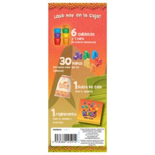 30 daus (5 de cada color), 6 cubilets (1 de cada color), 1 bossa, 1 tapa i instruccions.