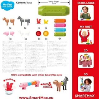 My First Farm Animals de SMARTMAX® permet als nens i nenes explorar el món fascinant del magnetisme d’una manera segura. 16 peces magnètiques de colors amb formes d’animals de granja. Munta 6 animals o barreja les peces! Totes les peces són 100% compatibles amb altres productes SMARTMAX.